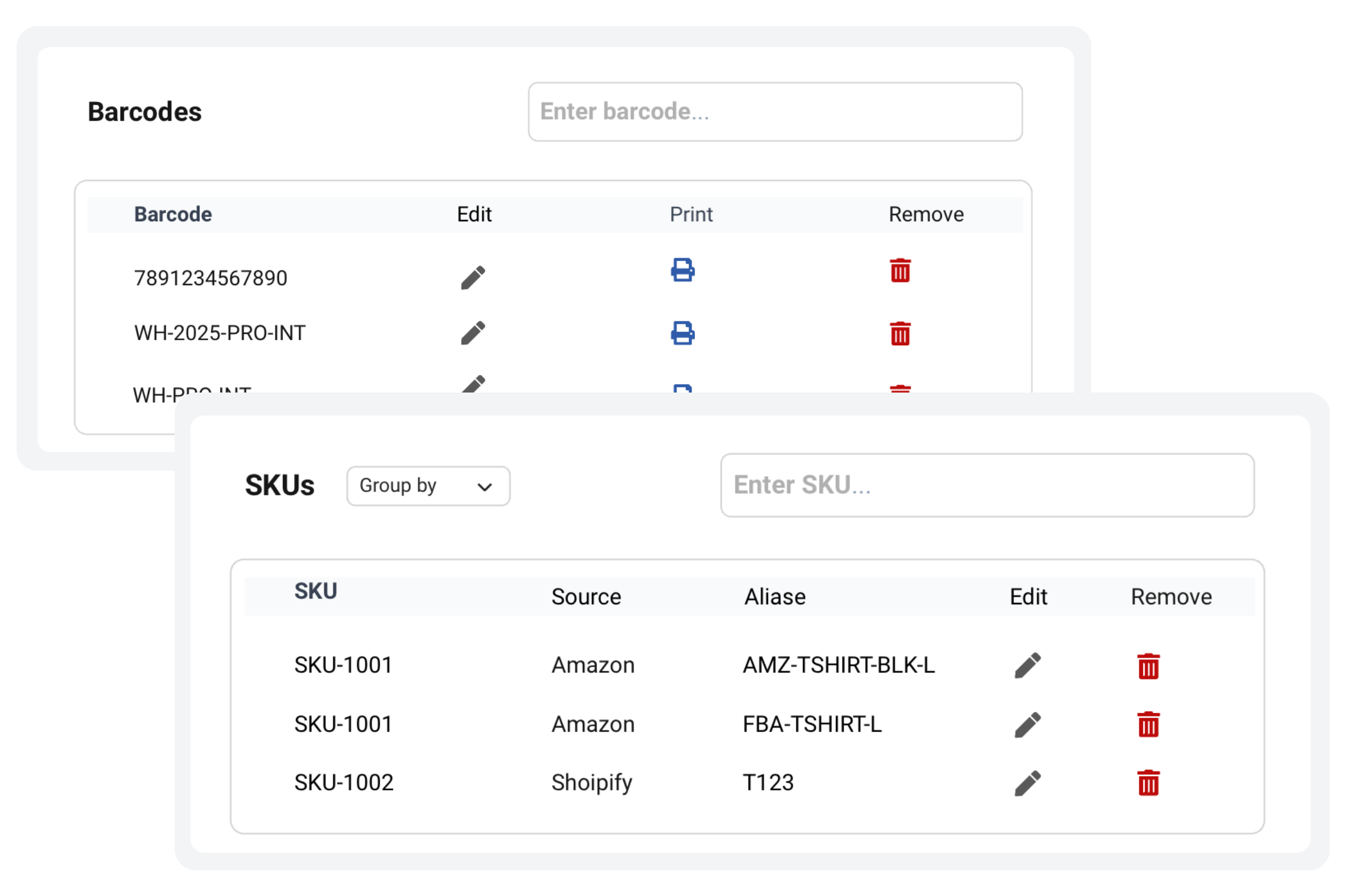 Easily manage products with multiple SKUs and aliases across different platforms. Whether your item exists under different codes for Amazon, Shopify, or your internal system, our platform keeps them perfectly linked and synchronized in one view.